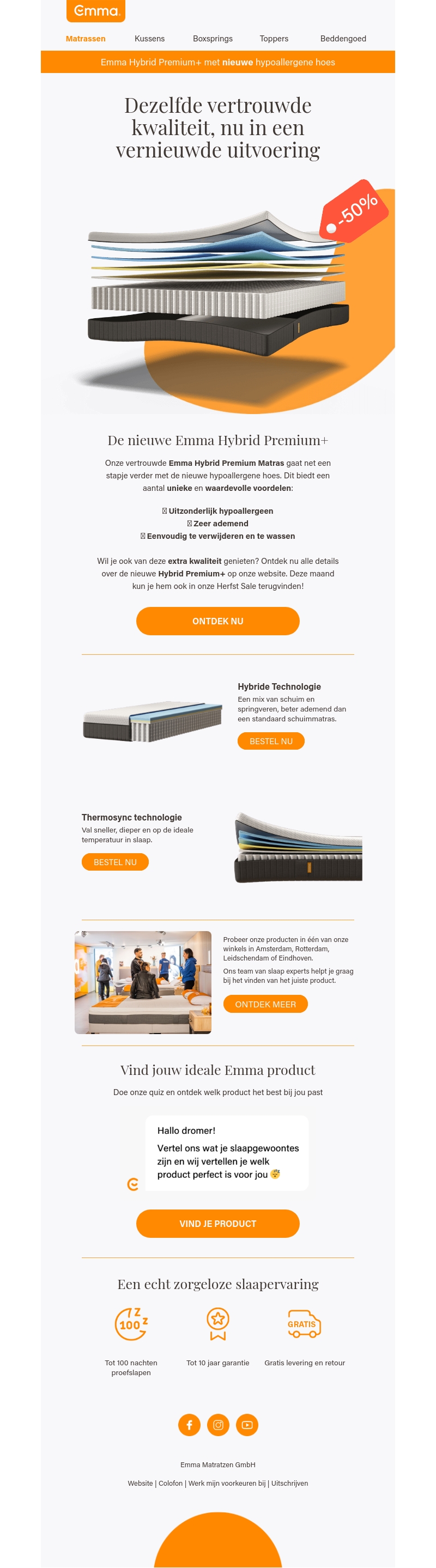 De Emma Hybrid Premium+ Matras biedt vertrouwde kwaliteit met unieke eigenschappen. Deze matras is uitzonderlijk hypoallergeen, zeer ademend en makkelijk te reinigen. Ideaal voor wie op zoek is naar extra slaapcomfort. Bezoek een van onze winkels of bestel online. Profiteer deze maand nog van de Herfst Sale.