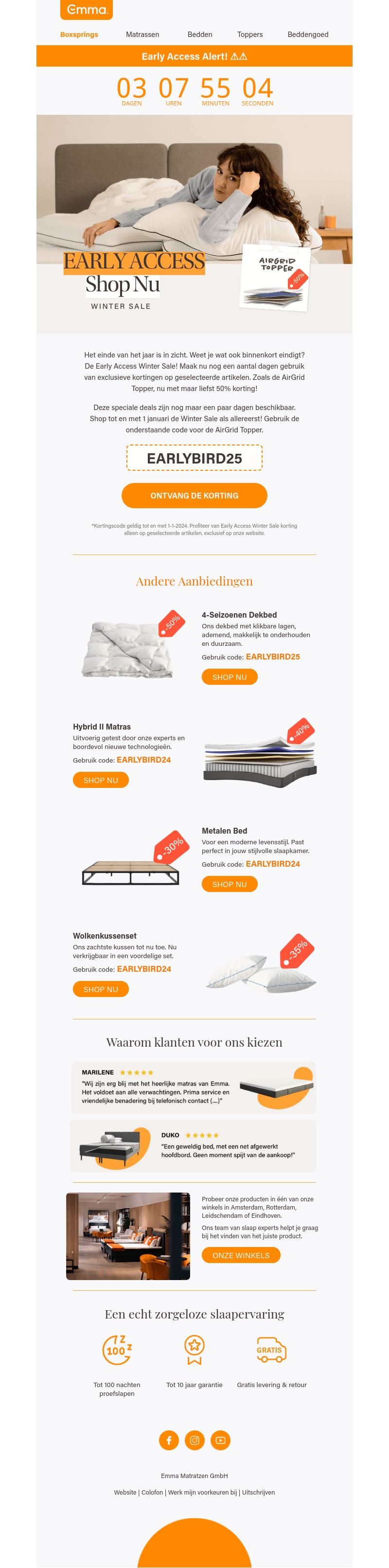 Doe mee met de vroege toegang tot de Emma Winter Sale en bespaar aanzienlijk op jouw aankopen. Ontdek exclusieve kortingen op matrassen, bedden en meer. Mis deze kans niet om jouw slaapkamer opnieuw in te richten met premium producten tegen een gereduceerde prijs. Gebruik nu onze kortingscodes voor de beste deals. Shop tot 1 januari en geniet van 50% korting op geselecteerde artikelen.