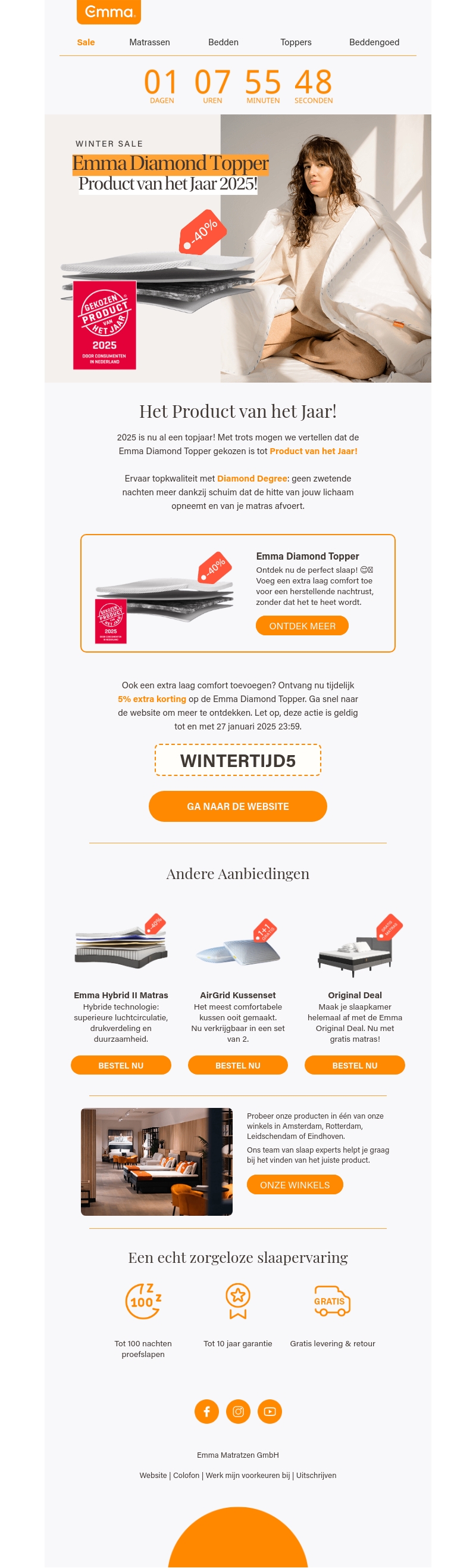 De Emma Diamond Topper is verkozen tot het Product van het Jaar 2025. Geniet van topkwaliteit slapen dankzij de Diamond Degree-technologie. Profiteer nu van 40% korting en voeg extra comfort toe met 5% extra korting. De aanbieding is geldig tot 27 januari 2025. Ontdek ook andere aanbiedingen zoals de Emma Hybrid II Matras.