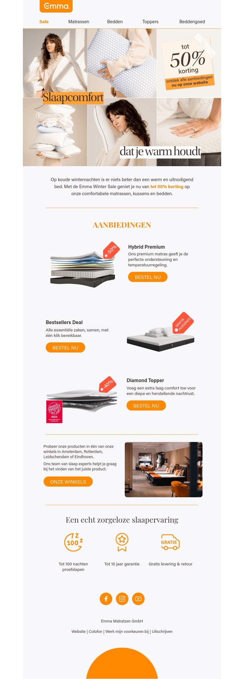 Beleef de ultieme winter warmte met Emma's Winter Sale. Geniet van tot 50% korting op onze comfortabele matrassen, kussens en bedden. Ons premium Hybrid matras biedt perfecte ondersteuning en temperatuurregeling. Voeg extra comfort toe met de Diamond Topper tegen een schitterende korting. Bezoek onze winkels voor deskundig advies en proefslapen tot 100 nachten.