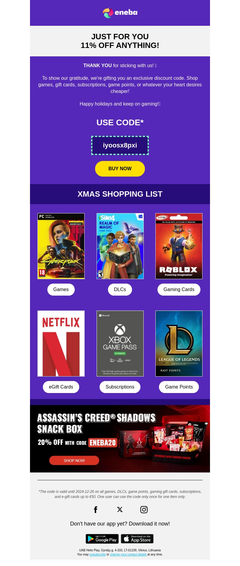 Bedank onze trouwe abonnees met een speciale korting van 11% op je favoriete aankopen. Gebruik de code iyoosx8pxi voor korting op games, giftcards, abonnementen, en meer. Mis deze kans niet om je kerstaankopen goedkoper te maken. Geniet van de feestdagen met geweldige deals.