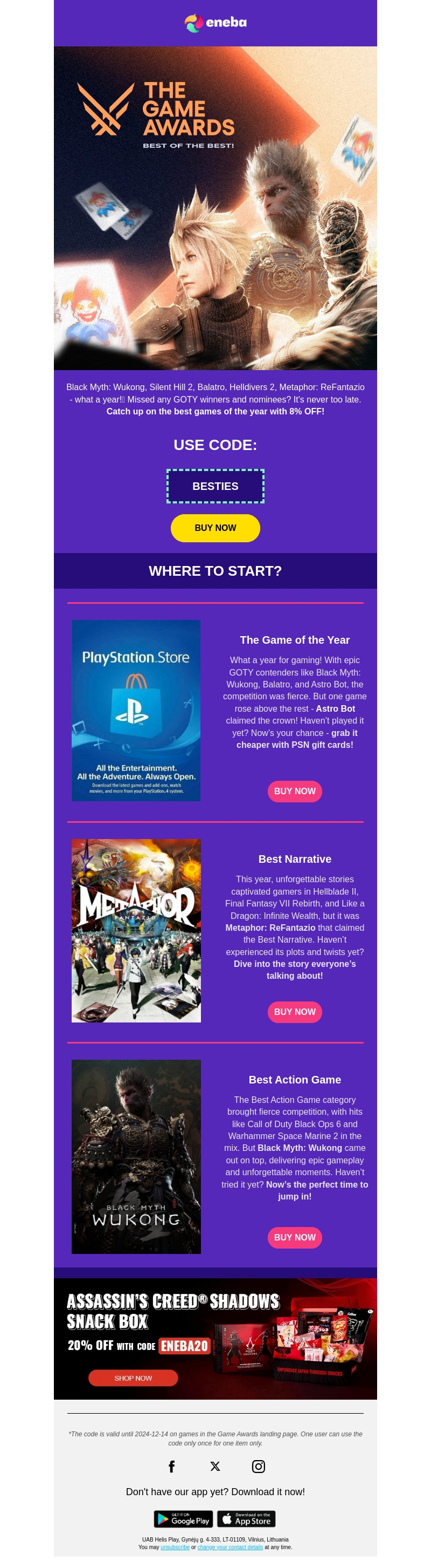De Game Awards van dit jaar hebben geweldige winnaars voortgebracht. Van epische verhalen tot actievolle gameplay, ontdek de titels die bovenaan het klassement staan. Gebruik code BESTIES voor 8% korting en duik in de wereld van topgames zoals Astro Bot en Metaphor: ReFantazio. Voor liefhebbers van actie is Black Myth: Wukong een must-play.