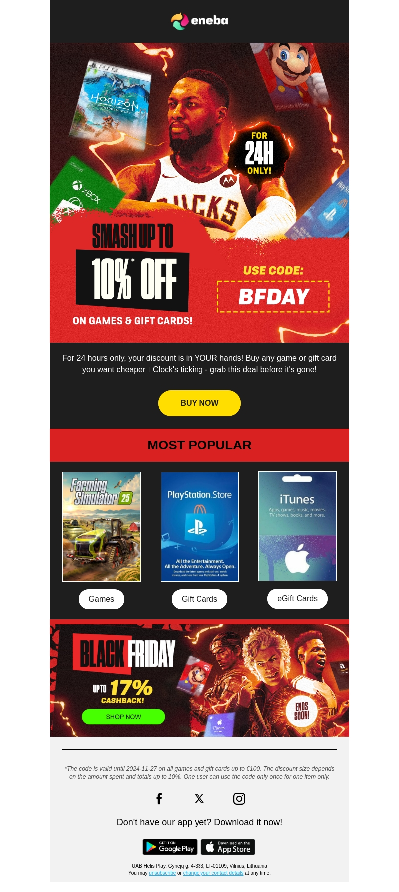 Beleef een ongelofelijke Black Friday bij Eneba! Profiteer van tot 10% korting op games en giftcards. Gebruik de kortingscode BFDAY en bepaal je eigen korting. Haast je, deze aanbieding is slechts 24 uur geldig. Mis je kans niet op favoriete deals. Ontdek nu wat er beschikbaar is voordat de tijd op is!