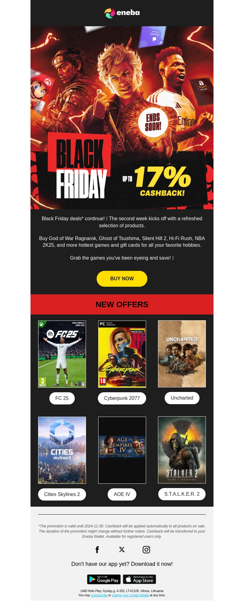 De Black Friday verkoop gaat verder met nieuwe, spannende aanbiedingen. Ontvang tot 17% cashback op uiteenlopende producten, waaronder top games en gift cards voor al je favoriete activiteiten. Mis de kans niet om te besparen op titels zoals God of War, Ghost of Tsushima en nog veel meer.