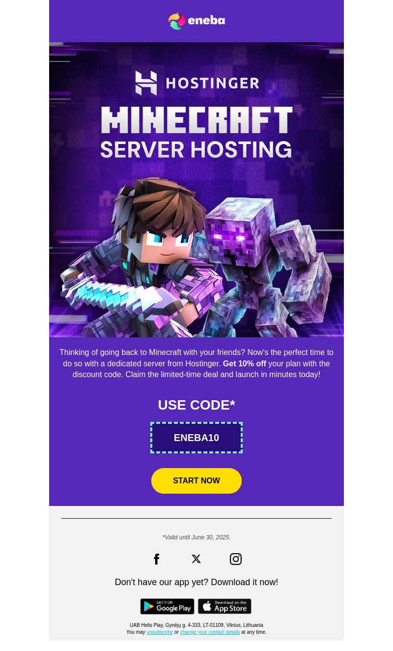 Wil je jouw eigen Minecraft server starten? Met Hostinger is dit nu mogelijk! Ontvang 10% korting op je hostingplan met de code ENEBA10. Begin vandaag nog en speel samen met je vrienden. Deze aanbieding is beperkt geldig, dus wacht niet te lang!