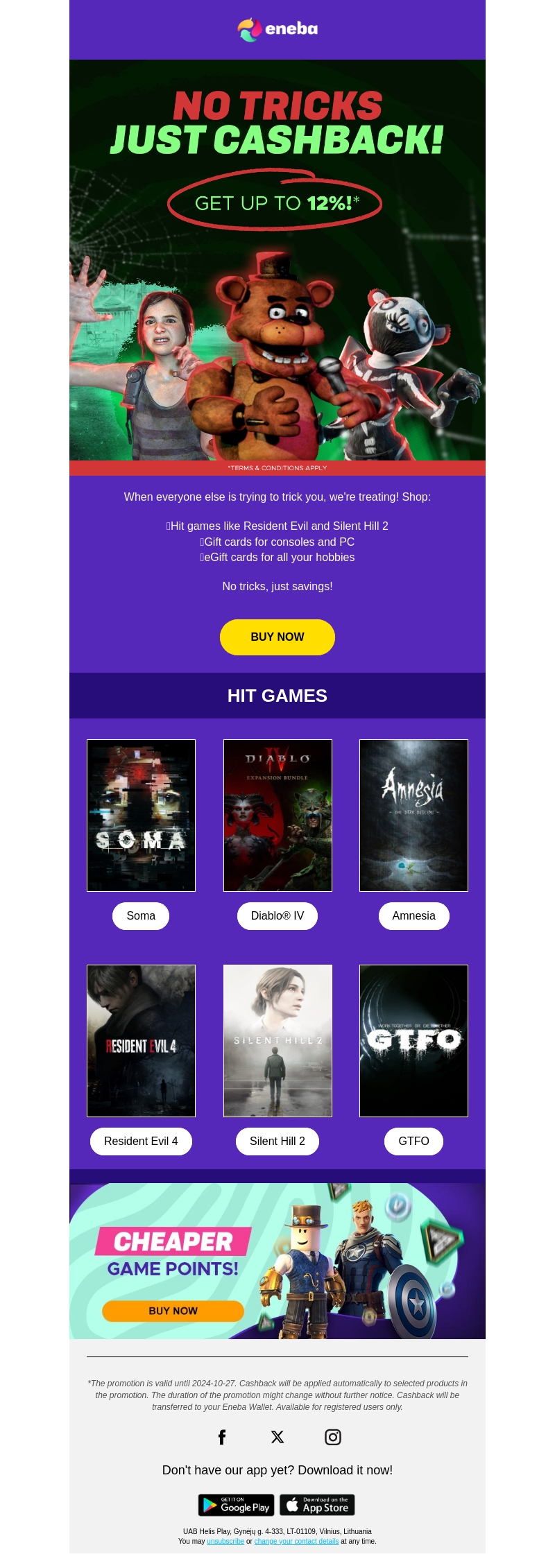 Verras jezelf met griezelige deals deze Halloween met Eneba! Profiteer van tot wel 12% cashback op populaire games zoals Resident Evil en Silent Hill 2. Maak je herfst nog spannender met cadeaubonnen voor consoles en pc. Mis deze kans niet om geweldige besparingen te scoren. Alleen bij Eneba: geen trucjes, alleen geweldige besparingen!
