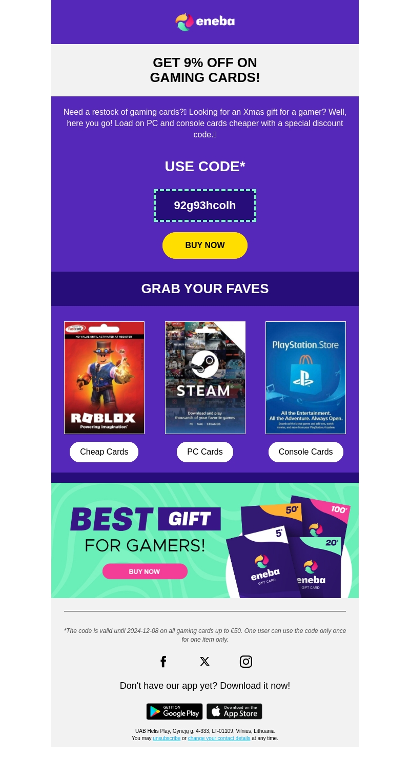 Profiteer nu van 9% korting op al je favoriete gaming kaarten bij Eneba. Of je nu op zoek bent naar PC, console of giftcards, wij hebben het allemaal. Ideaal als cadeau voor kerst of om je eigen collectie weer aan te vullen. Gebruik de speciale kortingscode en mis deze kans niet! Haal het meeste uit je gaming met voordelige opties. Bestel nu en bespaar meer.