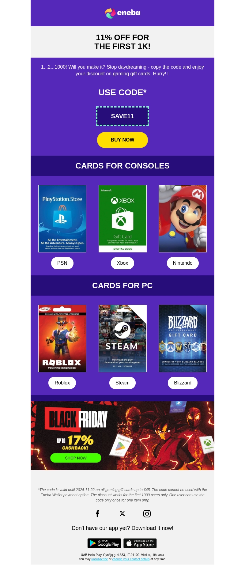 Mis deze kans niet om 11% korting te krijgen op gaming gift cards bij Eneba. Gebruik de code SAVE11 en claim je korting tijdens deze Black Friday actie. De korting is geldig voor de eerste 1000 gebruikers, dus wees er snel bij. Ontdek kaarten voor PSN, Xbox, Nintendo, Roblox, Steam en Blizzard. Voorwaarden zijn van toepassing.