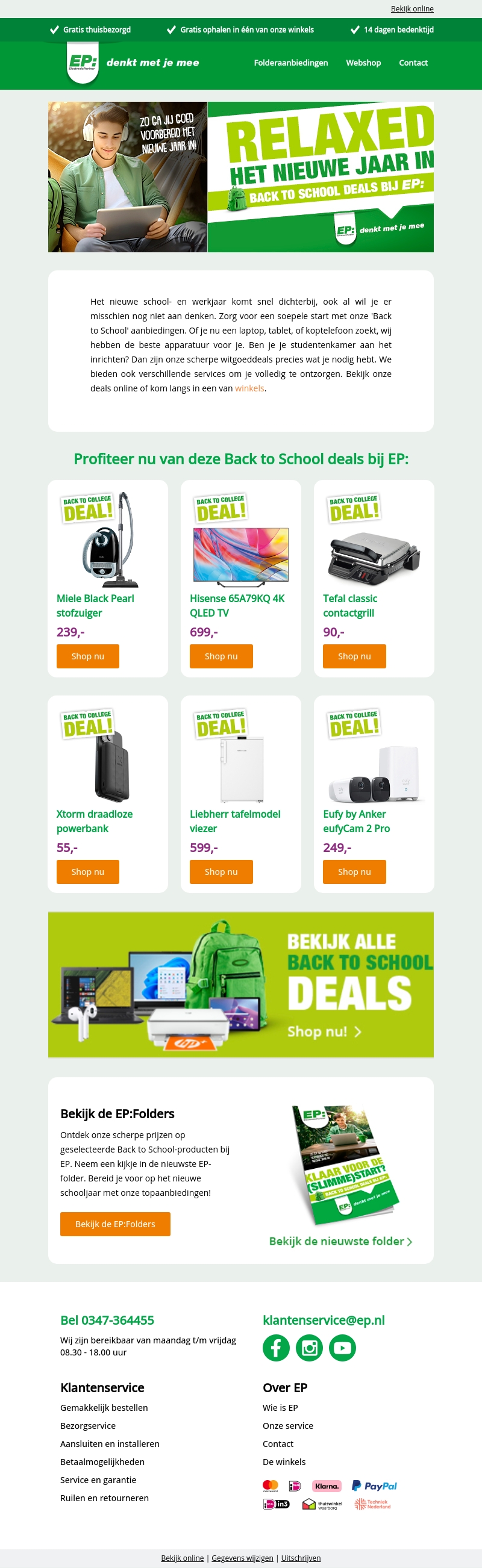 Het nieuwe schooljaar komt eraan, zorg dat je goed voorbereid bent met onze Back to School deals bij EP. Van laptops tot stofzuigers, wij hebben alles wat je nodig hebt. Bekijk onze scherpe aanbiedingen en profiteer nu van grote kortingen. Mis deze kans niet en start het jaar met de beste apparatuur en accessoires.