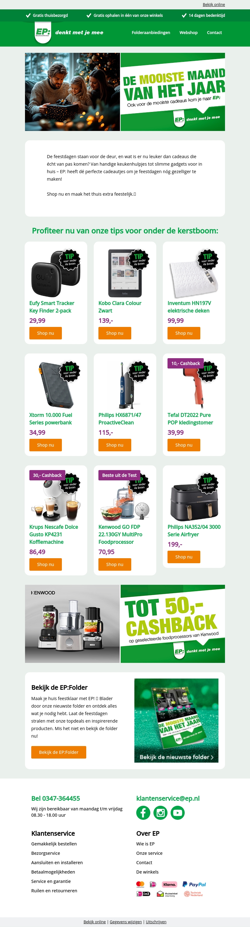 De feestdagen zijn nog leuker met de perfecte cadeaus van EP:. Kies uit handige keukenhulpjes tot slimme gadgets. Profiteer van onze tips, inclusief cashback op geselecteerde producten. Maak de feestdagen gezellig met de beste cadeautips onder jouw kerstboom. Bekijk de nieuwste folder voor meer inspiratie.