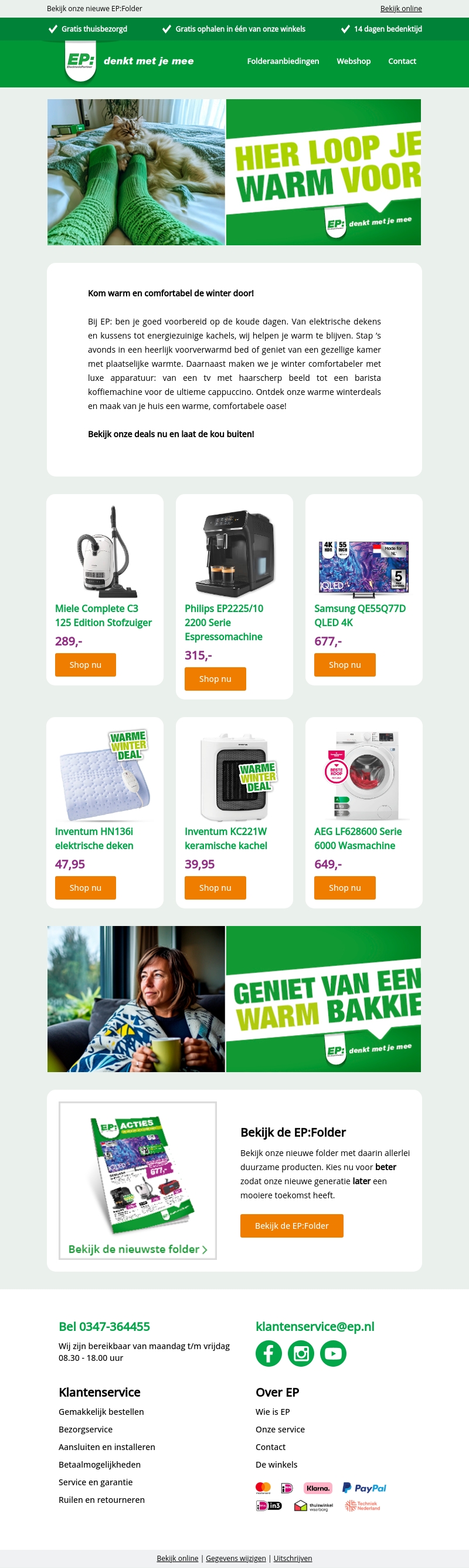 Bij EP: vind je alles voor een warme en comfortabele winter. Van elektrische dekens tot energiebesparende kachels, wij helpen je warm te blijven. Ontdek onze selectie van producten die jouw huis in een gezellige oase veranderen. Maak je klaar voor de koude dagen met onze voordelige aanbiedingen en geniet van extra comfort.