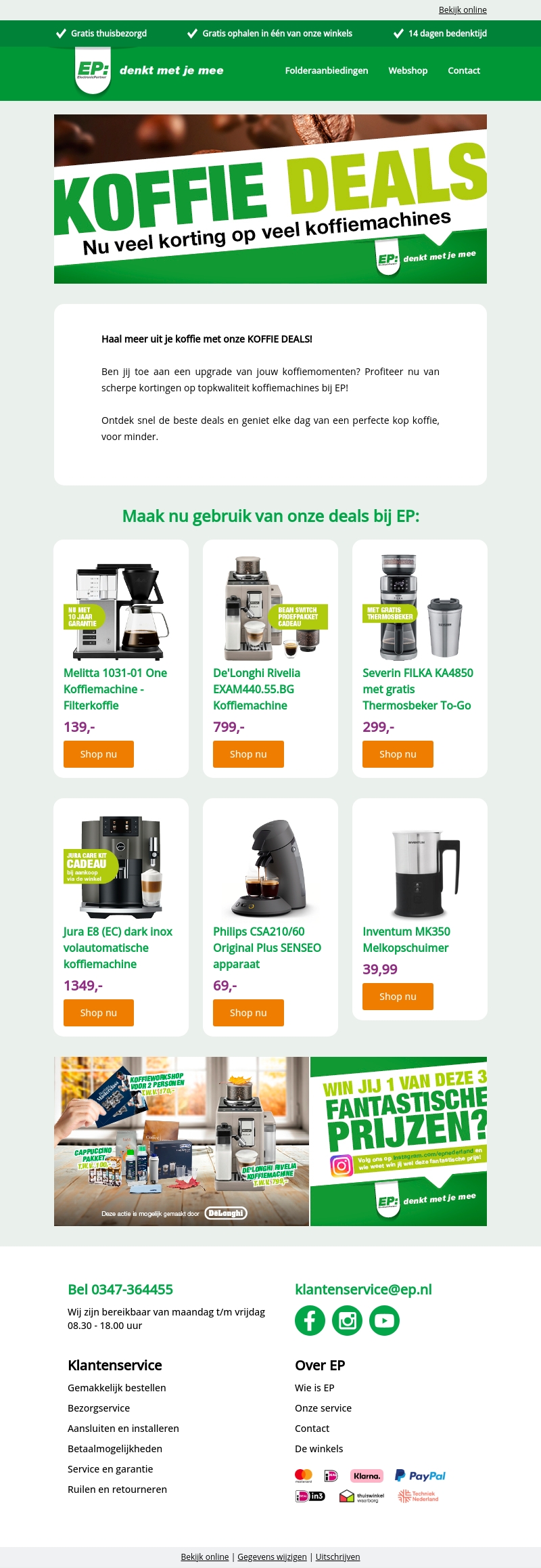 Het is tijd om te genieten van de heerlijke koffieproducten van EP! Met onze nieuwste koffiedeals kun je nu de beste koffiemachines aanschaffen tegen voordelige prijzen. Van filterkoffie tot volautomatische apparaten, er is iets voor elke koffieliefhebber. Mis deze geweldige kortingen niet en maak je koffiemomenten nog beter. Bovendien zijn er speciale aanbiedingen bij aankoop van geselecteerde producten. Ontdek de deals vandaag nog!