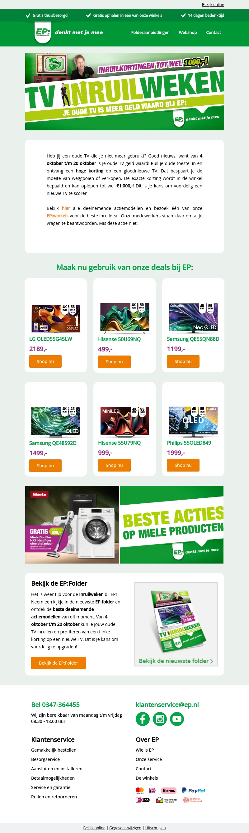 Heb je een oude TV die je niet meer gebruikt? Van 4 oktober tot en met 20 oktober zijn je oude toestellen meer waard bij EP! Ruil je oude TV in en ontvang hoge kortingen op een gloednieuwe. Er zijn exclusieve aanbiedingen op diverse modellen beschikbaar. Mis deze kans niet om voordelig je apparatuur te upgraden. Ontdek alle details in de EP-folder en bezoek de winkel voor meer informatie.