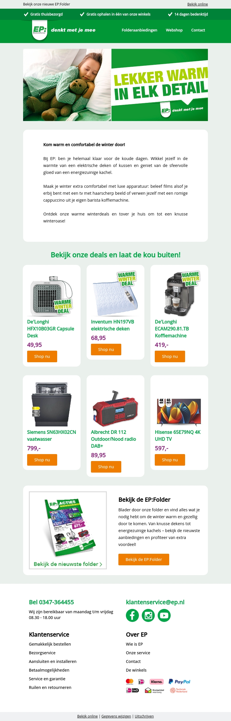Bij EP: vind je alles om je huis warm en gezellig te maken deze winter. Van elektrische dekens tot stijlvolle koffiemachines, geniet van de luxe en comfort. Bekijk de folder voor extra aanbiedingen en maak van je huis een winterparadijs.