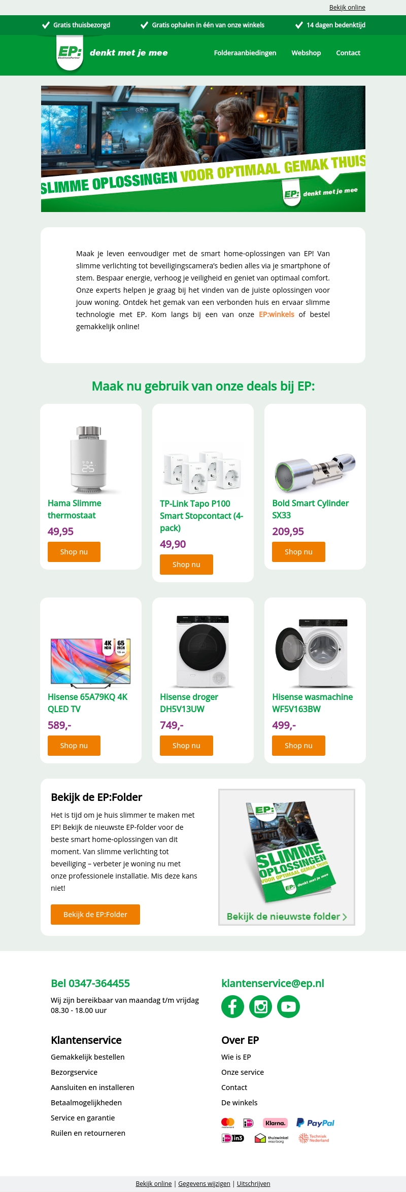 Maak je leven eenvoudiger met de smart home-oplossingen van EP. Bedien alles, van slimme verlichting tot beveiligingscamera's, via je smartphone. Bespaar energie, verhoog je veiligheid en geniet van optimaal comfort. Vind de juiste oplossingen voor jouw woning. Bezoek onze winkels of bestel online.