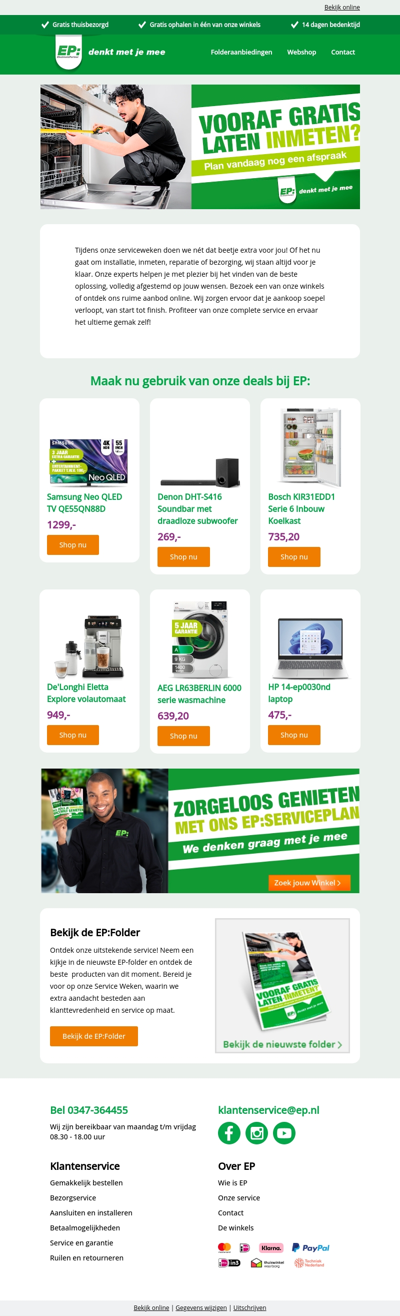 Maak gebruik van de uitgebreide services en scherpe aanbiedingen tijdens onze serviceweken bij EP. Of het nu gaat om installatie, inmeten, reparatie of bezorging, onze experts staan voor je klaar. Ontdek onze nieuwste aanbiedingen en producten die volledig afgestemd zijn op jouw wensen.