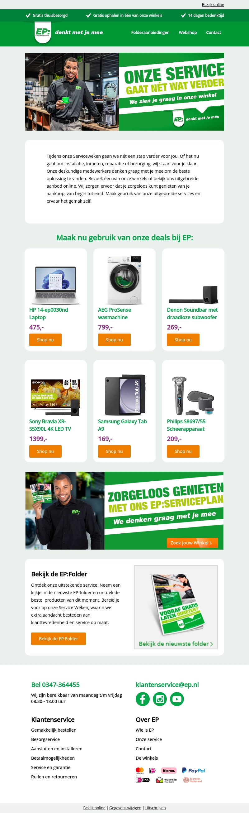 Tijdens onze Serviceweken bieden we uitgebreide diensten zoals installatie, inmeten, reparatie en bezorging. Bezoek onze winkels voor de beste deals op producten zoals laptops, wasmachines en meer. Zorgeloos genieten van je aankoop met EP's uitmuntende service.