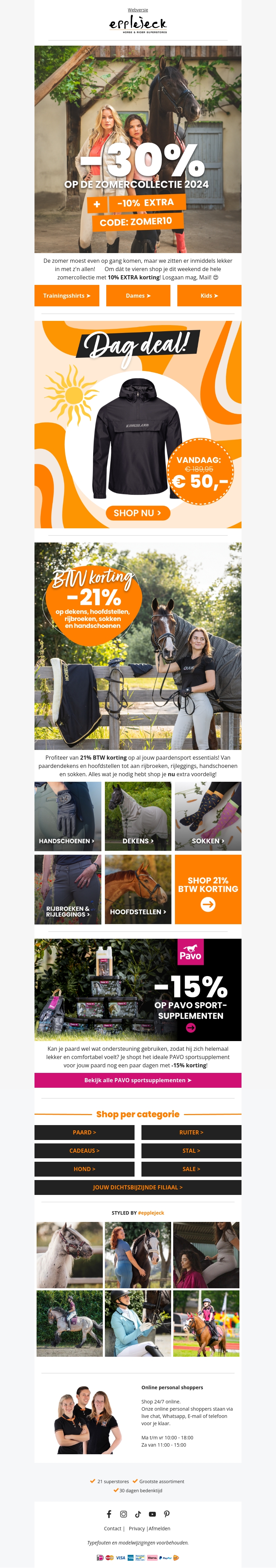 Deze zomer kun je genieten van 10% extra korting op de hele zomercollectie 2024 bij Epplejeck. Gebruik de kortingscode ZOMER10 om van deze speciale aanbieding te profiteren. Mis het niet en shop nu je favoriete zomeroutfits, accessoires en paardensport benodigdheden. Ontdek ook de speciale dagdeal en BTW korting acties!