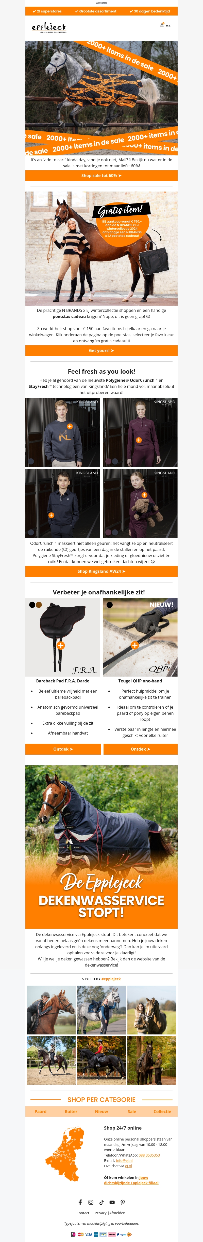 Epplejeck biedt een geweldige sale aan met meer dan $2000 aan kortingen! Van paardendekens tot stijlvolle kleding, er is voor ieder wat wils. Haal het maximale uit je paardensport ervaring met innovatieve producten. Bezoek onze winkel of shop online en profiteer van de gratis cadeaus. Mis deze unieke kans niet om kwaliteitsartikelen tegen lage prijzen te scoren!