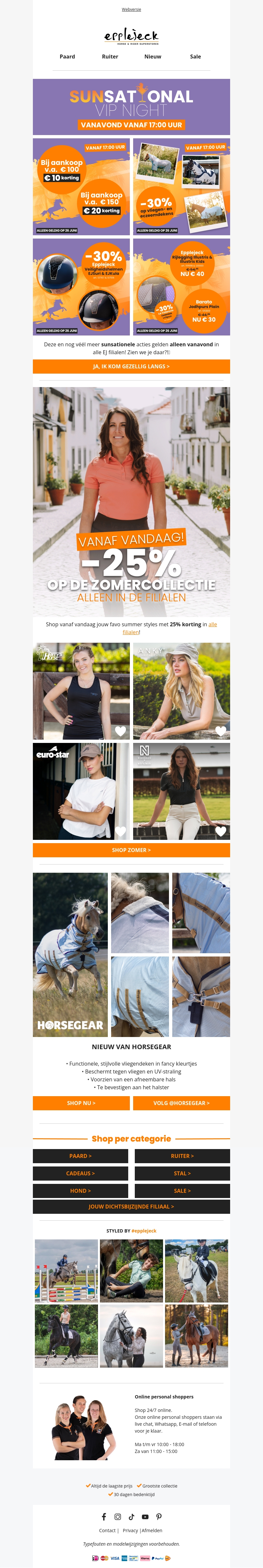 Bezoek onze winkel vandaag voor de Sunsational VIP Night! Vanaf 17:00 uur profiteer je van geweldige kortingen tot 30% op geselecteerde artikelen en extra korting bij aankopen vanaf €100 en €150. Ook krijg je 25% korting op de zomercollectie in alle filialen. Deze aanbiedingen zijn alleen vanavond geldig!