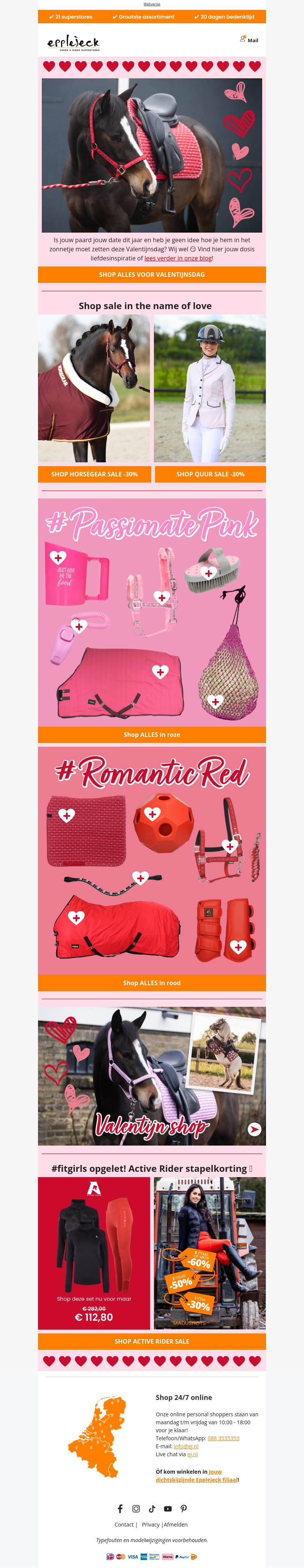 Zoek je de perfecte Valentijnsdag cadeaus voor paardenliefhebbers? Deze nieuwsbrief biedt stijlvolle paardrijproducten en exclusieve kortingen. Van #PassionatePink tot #RomanticRed collecties, er is voor ieder wat wils. Profiteer van de Active Rider stapelkorting en maak je Valentijnsdag speciaal.