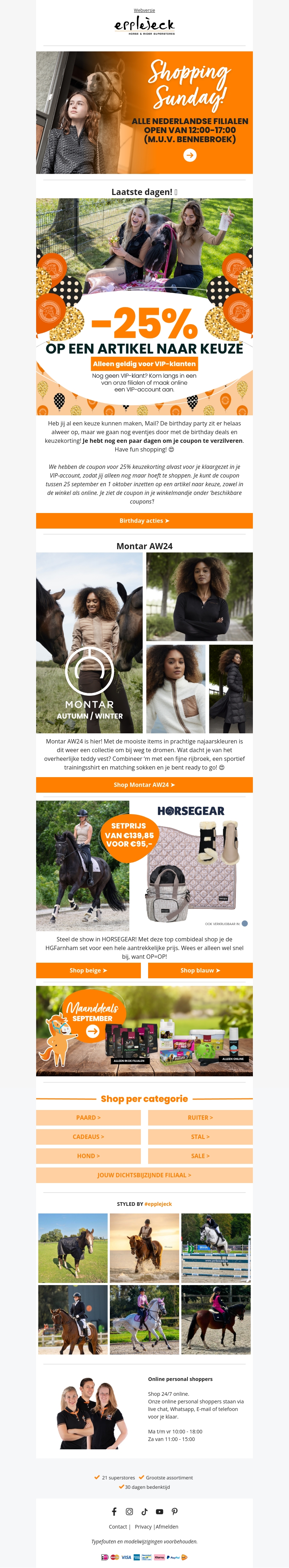 Neem deel aan Shopping Sunday bij Epplejeck! Bezoek alle Nederlandse filialen die open zijn van 12:00 tot 17:00 uur, behalve Bennebroek. Profiteer van 25% korting op een artikel naar keuze. Daarnaast presenteert Montar zijn herfst/wintercollectie en zijn er speciale aanbiedingen op paardenspullen van Horsegear. Maak het meeste van deze acties en shop jouw favorieten!