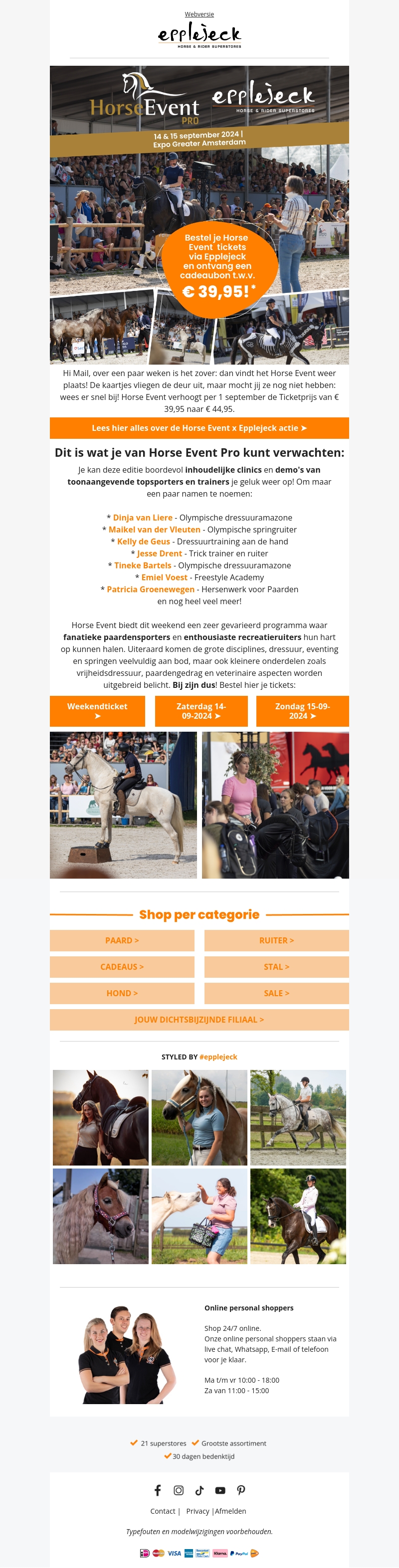 Het Horse Event komt eraan op 14 en 15 september 2024 in Expo Greater Amsterdam. Koop je tickets via Epplejeck en ontvang een cadeaubon ter waarde van β¬39,95. Het evenement biedt clinics en demo's van toptrainers, ideaal voor fanatieke paardenliefhebbers en recreatieruiters. Mis het niet!