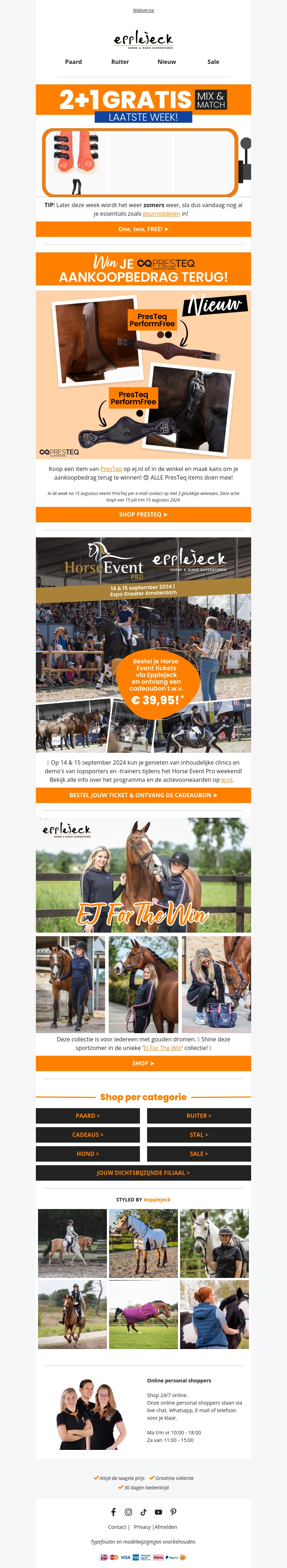 Profiteer van de laatste week van de 2+1 Gratis Mix & Match actie bij Epplejeck! Ontvang bovendien jouw aankoopbedrag terug bij aankoop van PresTeq items. Vergeet ook niet je tickets voor Horse Event 2024 te bestellen en ontdek de nieuwe EJ 'For The Win' collectie.