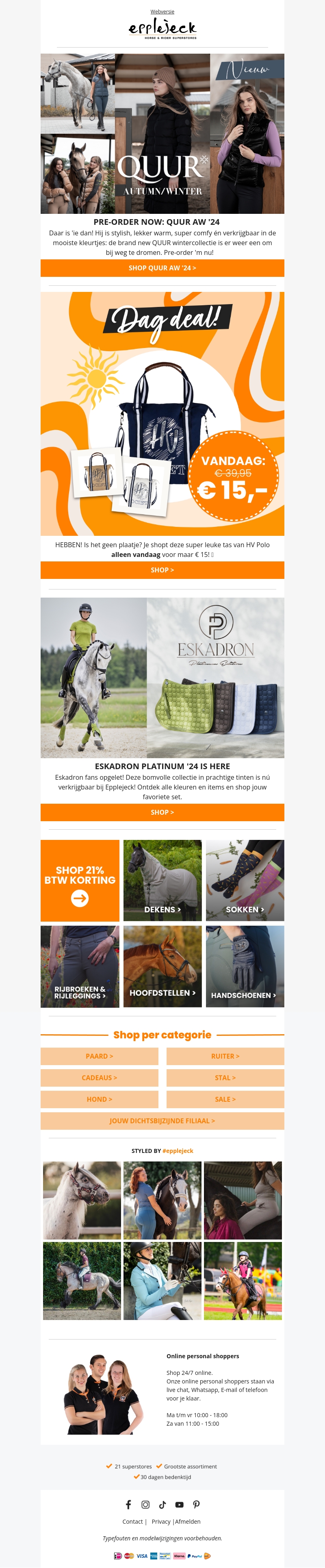 De herfst/winter collectie van Quur is nu beschikbaar bij Epplejeck! Ontdek stijlvolle, warme en comfortabele mode voor het nieuwe seizoen. Mis onze dagdeal niet: een super leuke tas van HV Polo voor slechts β¬15! Bekijk ook de nieuwe Eskadron Platinum collectie, nu verkrijgbaar.