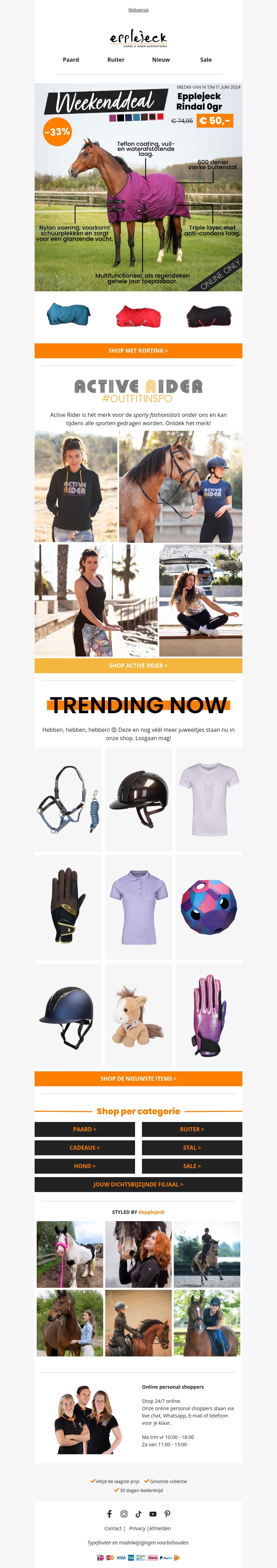 Scoor nu de beste weekenddeals bij Epplejeck met maar liefst 33% korting! Van paardrijjassen met teflon coating tot trendy Active Rider outfits. Mis ook de nieuwste accessoires en must-haves niet. Winkelen was nog nooit zo leuk!