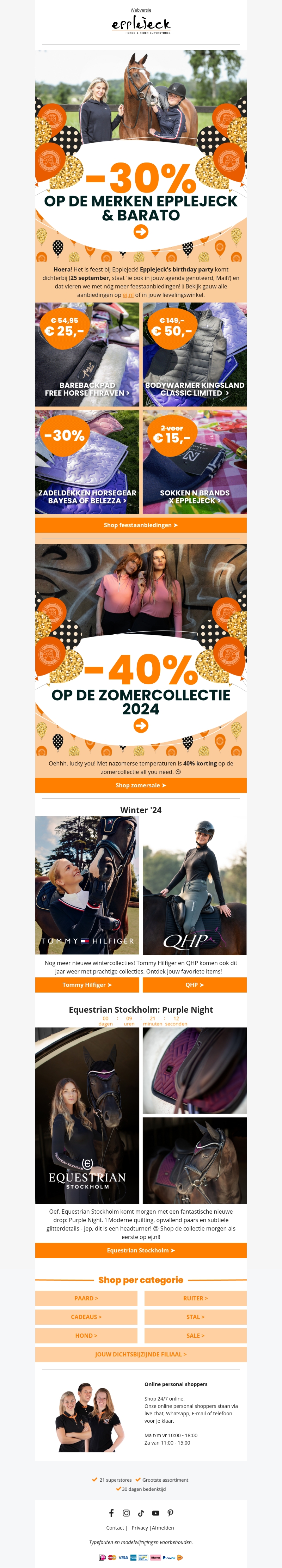 Het is feest bij Epplejeck! Vier mee met geweldige kortingen tot wel 40% op de merken Epplejeck en Barato. Mis ook niet de aanbiedingen op de zomercollectie 2024. Daarnaast zijn er nieuwe wintercollecties van Tommy Hilfiger en QHP en een exclusieve drop van Equestrian Stockholm. Shop jouw favorieten nu!