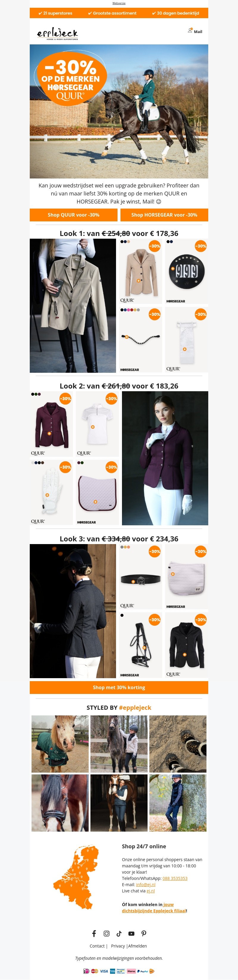 Profiteer nu van maar liefst 30% korting op de merken QUUR en HORSEGEAR bij Epplejeck. Upgrade je wedstrijdlook of dagelijkse ruiteroutfit met stijlvolle en functionele ruitersportartikelen. Het aanbod varieert van kleding tot accessoires, allemaal ontworpen om uw rijervaring te verbeteren. Pak snel je kans en shop nu online of bezoek een van de 21 superstores.