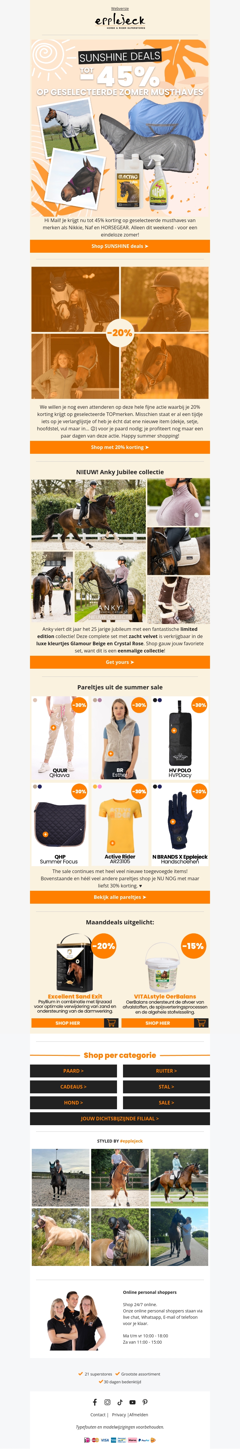 Geniet van geweldige zomer aanbiedingen met tot wel 45% korting op must-haves van merken zoals Naf en HORSEGEAR. Bekijk onze selectie en shop nu jouw nieuwe zomergarderobe. Dit weekend speciale deals op geselecteerde producten. Inclusief de nieuwste Anky jubileum collectie en verrassende extra kortingen!