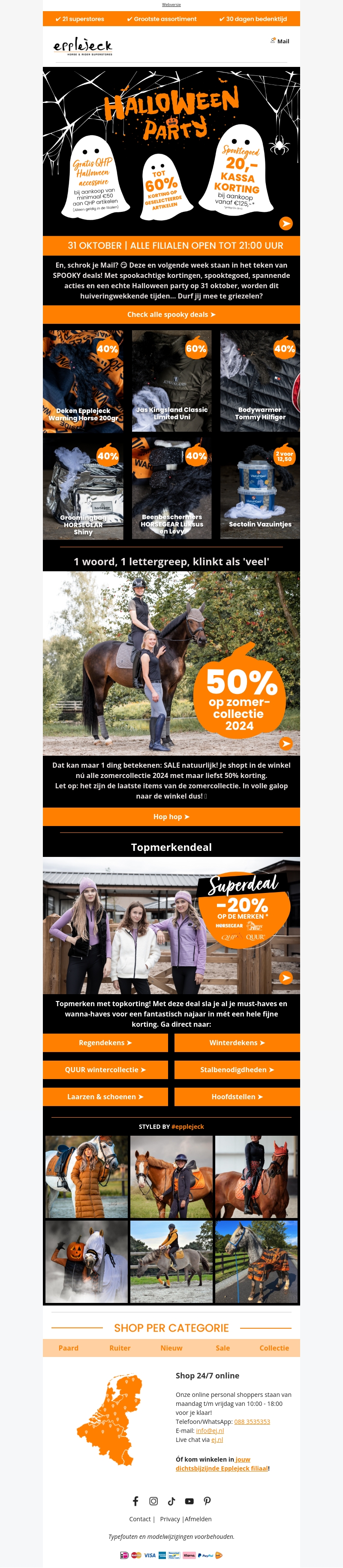 Laat je verrassen door de spannende Halloween aanbiedingen bij Epplejeck! Profiteer van gratis Halloween accessoires, tot 60% korting op geselecteerde items en een kassa korting van 20%. Bezoek ons op 31 oktober voor een echte Halloween ervaring. Durf jij het aan?