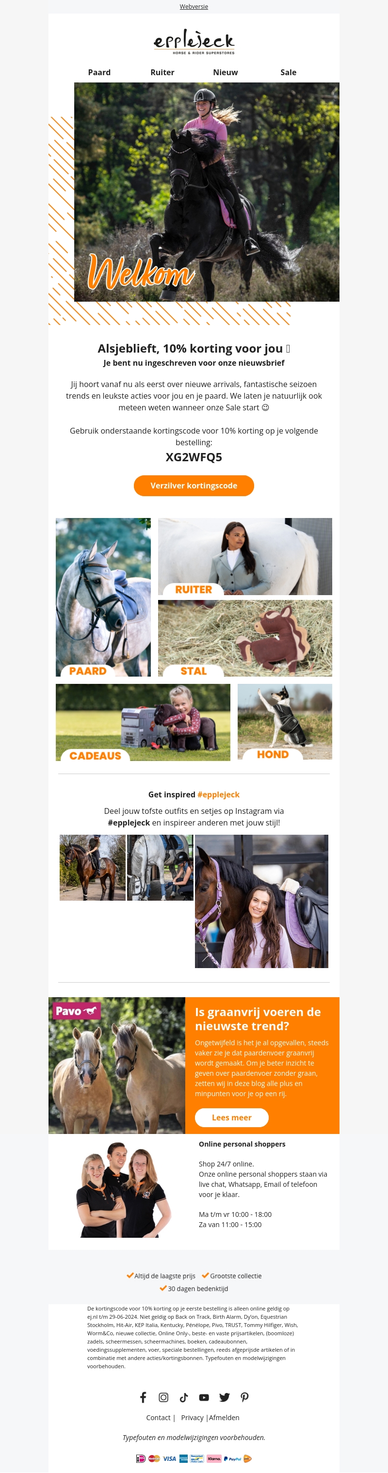 Je bent nu ingeschreven voor onze nieuwsbrief! Ontvang 10% korting op je volgende bestelling met de code XG2WFQ5. Blijf op de hoogte van nieuwe aankomsten, de laatste trends en fantastische acties voor jou en je paard.