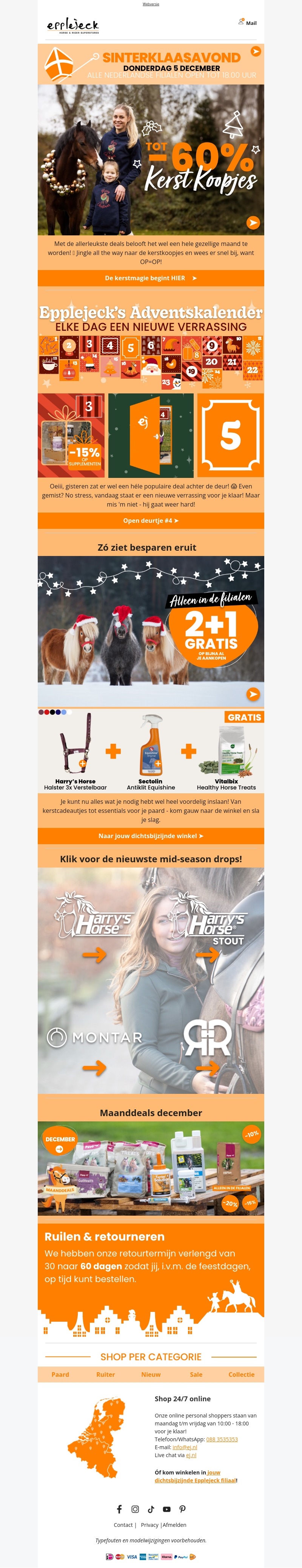 Profiteer van fantastische Sinterklaas- en Kerstaanbiedingen met kortingen tot 60%. Ontdek de adventskalender van Epplejeck met elke dag een nieuwe verrassing en speciale aanbiedingen zoals 2+1 gratis in de winkels. Laat je inspireren door de nieuwste collecties van Harry's Horse, Montar en meer. Mis de maanddeals van december niet en verleng je retourperiode tot 60 dagen. Bezoek snel je dichtstbijzijnde winkel!