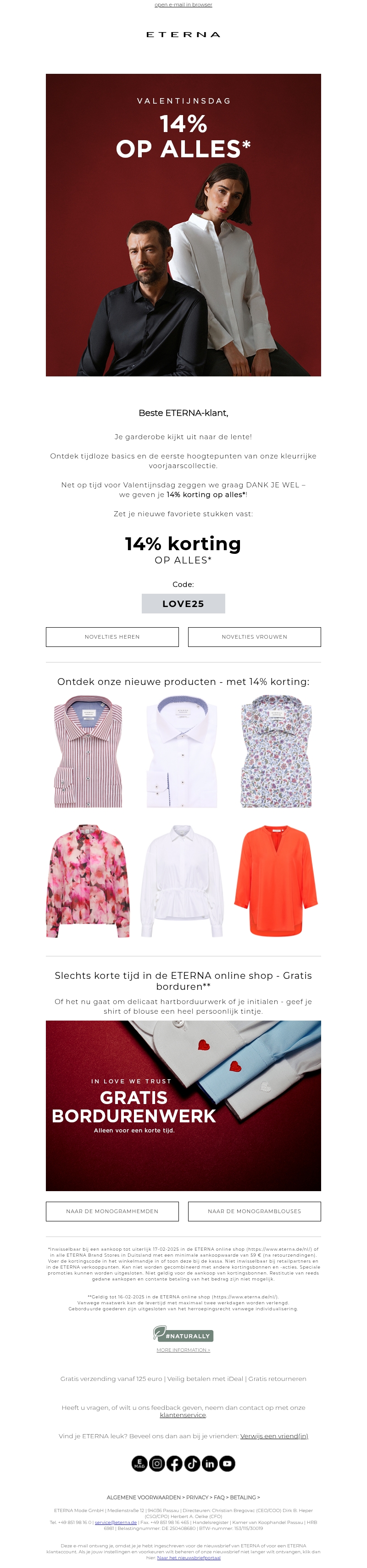 Eterna biedt nu 14% korting op alles in hun collectie voor Valentijnsdag. Ontdek de nieuwe voorjaarscollectie met tijdloze basics en kleurrijke noviteiten. Mis deze kans niet om je garderobe te vernieuwen en profiteer van gratis borduurwerk voor een persoonlijke touch.