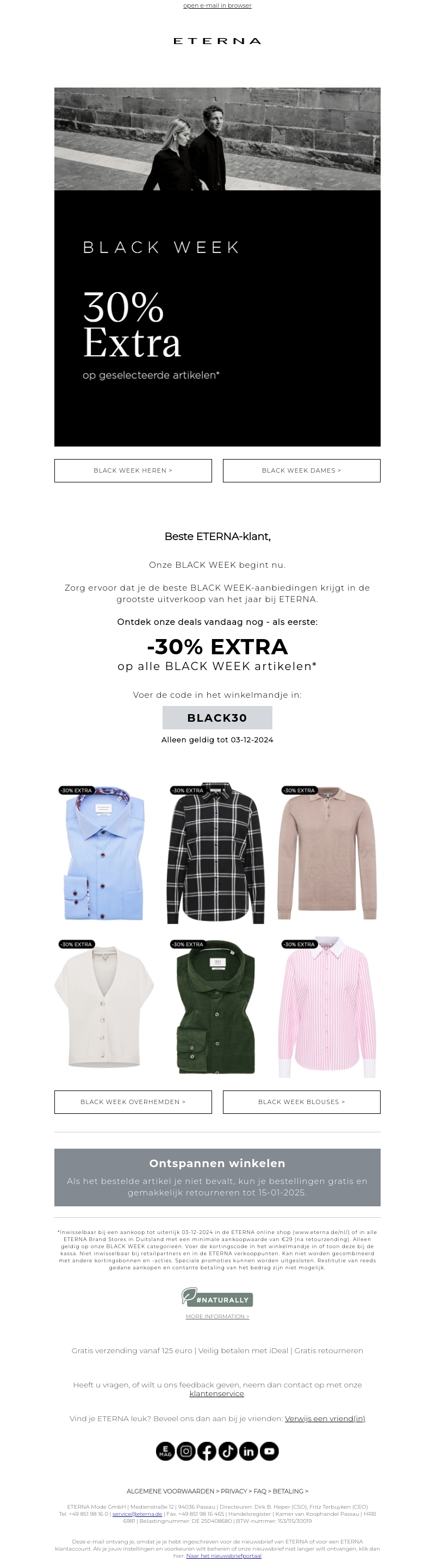 Eterna's Black Week is begonnen, en je kunt nu profiteren van 30% extra korting op geselecteerde artikelen. Mis deze kans niet om je garderobe te vernieuwen met stijlvolle opties voor zowel heren als dames. De aanbieding is geldig tot 3 december 2024. Gebruik de code BLACK30 bij het afrekenen. Geniet van gratis verzending vanaf €125.