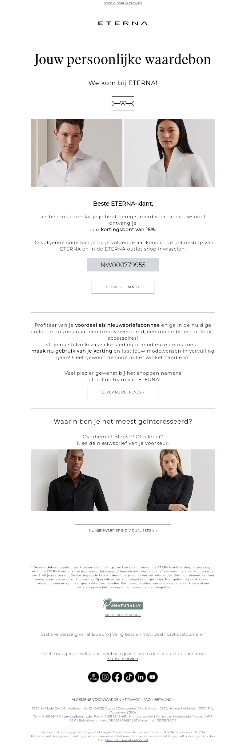 Beste ETERNA-klant, als bedankje voor je registratie ontvang je een kortingsbon van 15%. Gebruik deze bij je volgende aankoop in onze webshop of outlet. Ga op zoek naar trendy overhemden, mooie blouses of leuke accessoires en profiteer nu van jouw korting!