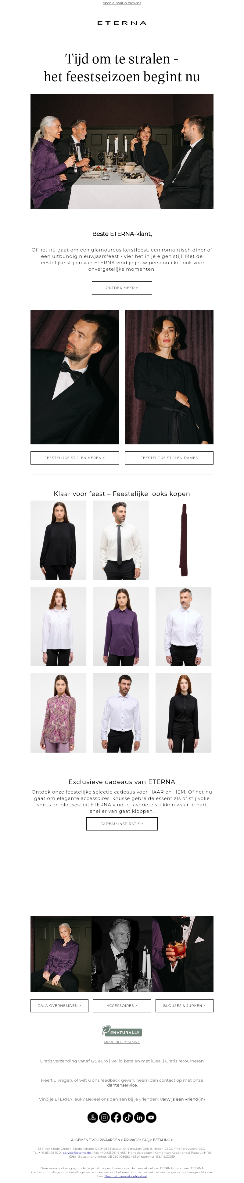 Ontdek de feestelijke collectie van ETERNA met stijlvolle mode voor het kerstseizoen. Of je nu gaat voor een romantisch diner of een spetterend nieuwjaarsfeest, vind jouw perfecte look. Verken onze selectie met feestelijke stijlen voor heren en dames en exclusieve cadeau-ideeën voor iedere gelegenheid.
