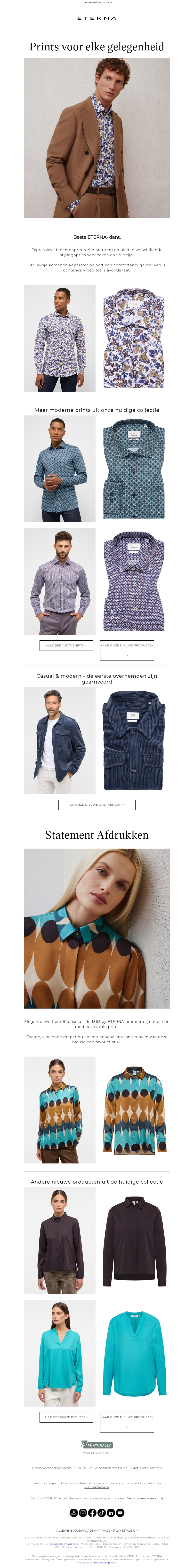 Breng je garderobe tot leven met de nieuwste collectie van ETERNA! Ontdek een scala aan opvallende prints voor elke gelegenheid. Deze stijlvolle en veelzijdige items zijn perfect voor een frisse update van je outfit.