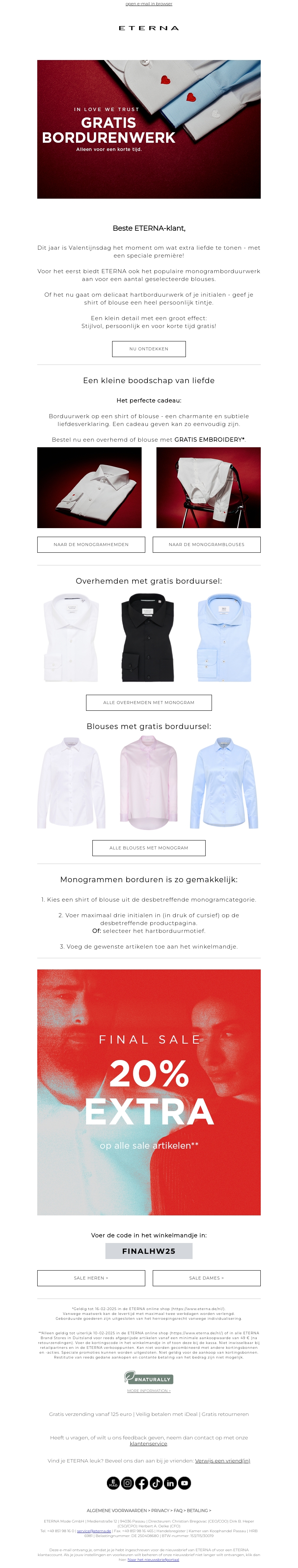 Ontdek de Valentijnsactie van Eterna met gratis monogramborduurwerk op geselecteerde overhemden en blouses. Voeg een persoonlijke touch toe aan je kleding en steel de show op Valentijnsdag. Mis deze unieke kans niet om extra liefde te tonen met een stijlvol cadeau. De actie is voor beperkte tijd, dus wees er snel bij!