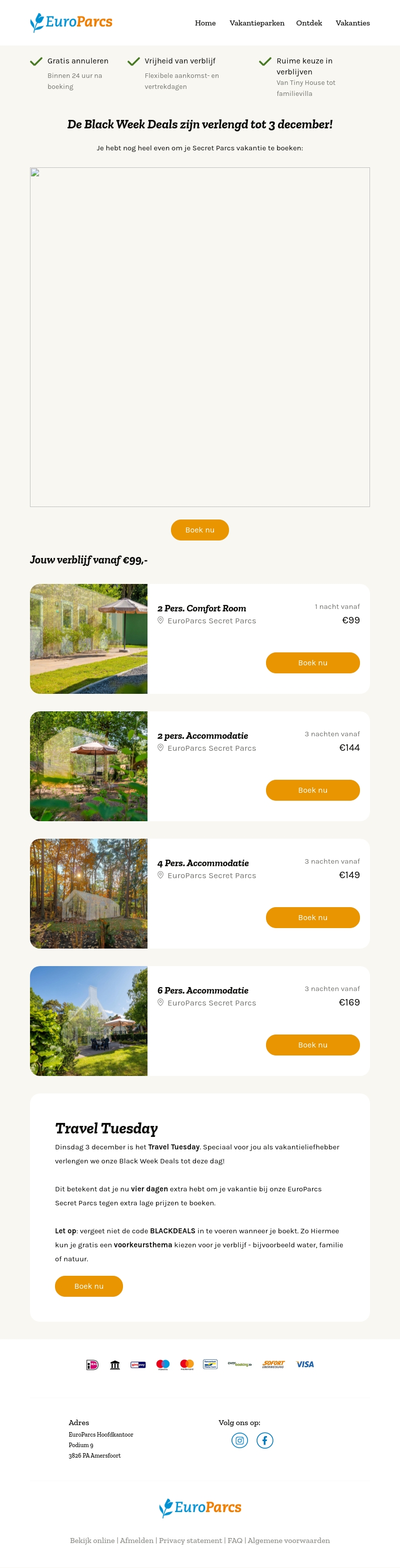 Ontdek de verlengde Black Week Deals bij EuroParcs, nu beschikbaar tot 3 december. Geniet van flexibele verblijfsopties en verblijf vanaf slechts β¬99. Maak een keuze uit verschillende accommodaties voor 2 tot 6 personen en boek je ideale vakantie eenvoudig online. Vergeet niet de code BLACKDEALS te gebruiken voor extra voordelen.