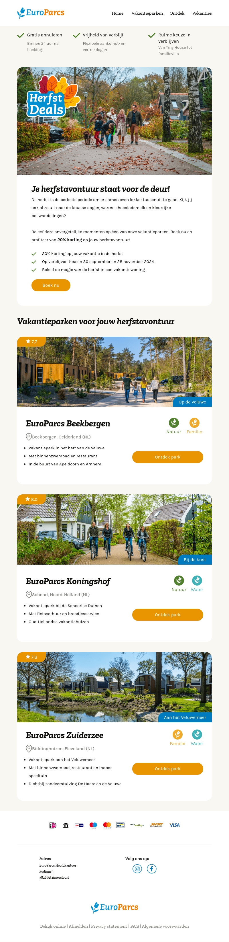De herfst is perfect voor een heerlijke vakantie. Ontdek de herfstdeals van EuroParcs en geniet van 20% korting op je verblijf. Bezoek onze vakantieparken en ervaar de magie van de herfst.