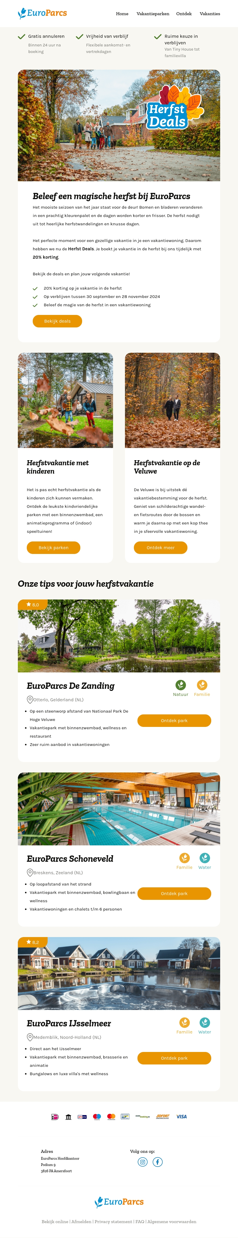 Beleef een magische herfst bij EuroParcs met onze exclusieve herfstdeals. Geniet van adembenemende natuur, gezellige vakantiewoningen, en leuke activiteiten voor het hele gezin. Ontdek onze parken en plan nu uw herfstvakantie met kortingen tot wel 20%. Mis deze unieke kans niet!