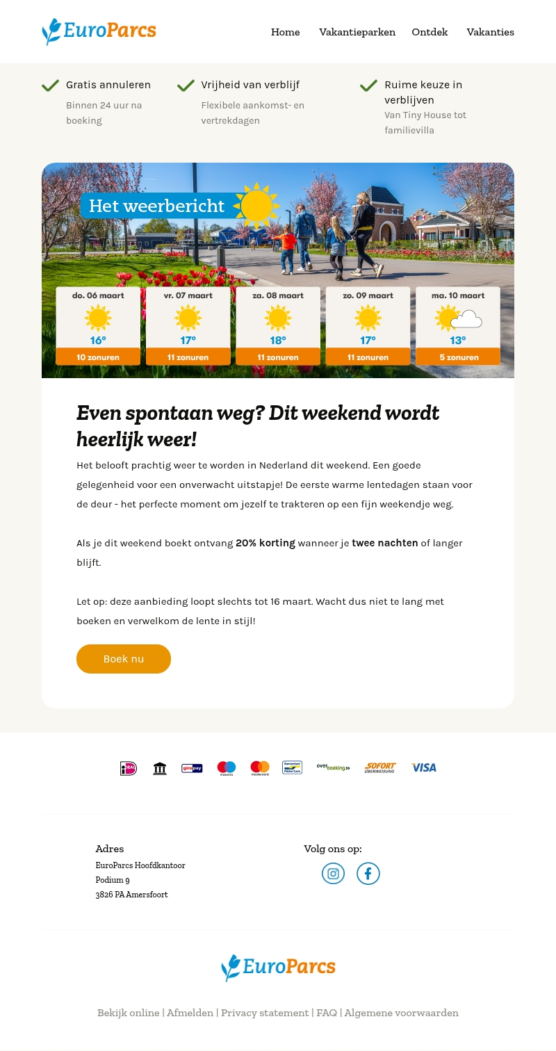 Geniet van prachtig weer in Nederland en boek een spontaan weekendje weg bij EuroParcs. Met 20% korting op tweedaagse verblijven kun je heerlijk ontsnappen aan de dagelijkse sleur. Deze aanbieding is geldig tot 16 maart, dus wees er snel bij en beleef de lente in stijl.