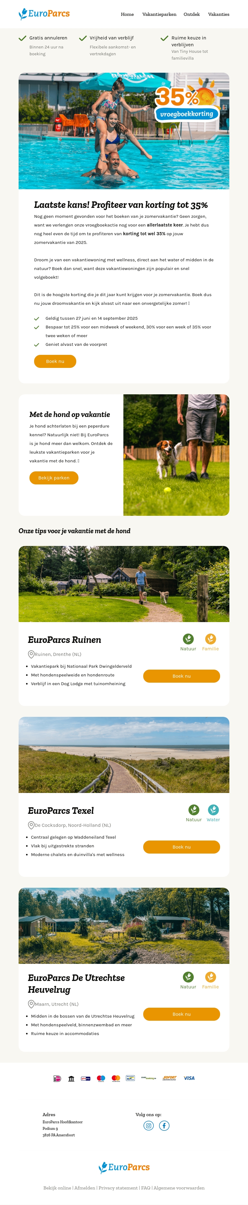Nog heel even de tijd om te profiteren van tot 35% korting op je zomervakantie bij EuroParcs. Boek nu en ontdek prachtige vakantieparken met speciale activiteiten en accommodaties, inclusief opties voor een vakantie met je hond.