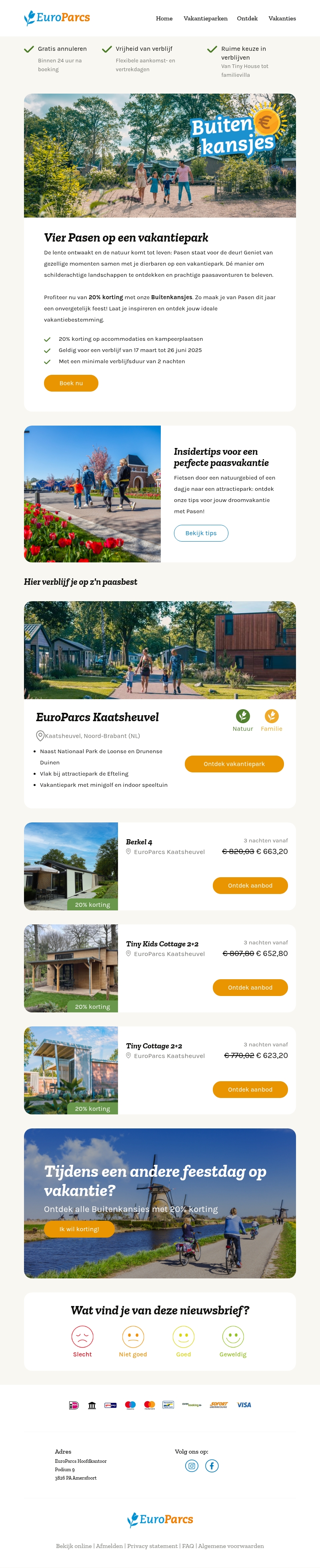 Beleef een onvergetelijke Pasen bij EuroParcs! Geniet van ons aanbod met 20% korting op geselecteerde accommodaties. Ontdek prachtige natuur en schilderachtige landschappen terwijl je ontspant in comfortabele verblijven. Boek vandaag nog en maak gebruik van tal van voorzieningen voor het hele gezin. Laat je inspireren door onze tips voor een perfecte paasvakantie!