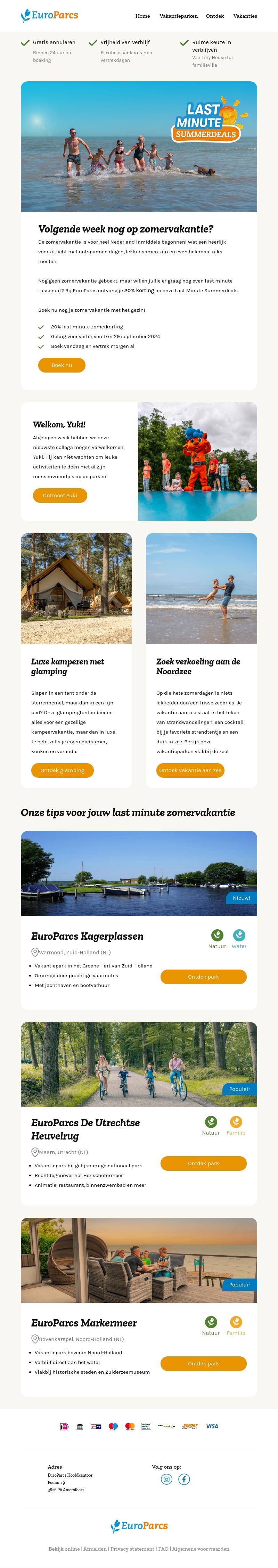 De zomervakantie is begonnen en wat is een beter moment om te genieten van een last minute strandvakantie met 20% korting? Bij EuroParcs kun je kiezen uit diverse mooie locaties en profiteren van flexibele verblijfsdata. Ontmoet onze mascotte Yuki en ontdek luxe kampeermogelijkheden of ontspannen vakanties aan de Noordzee.