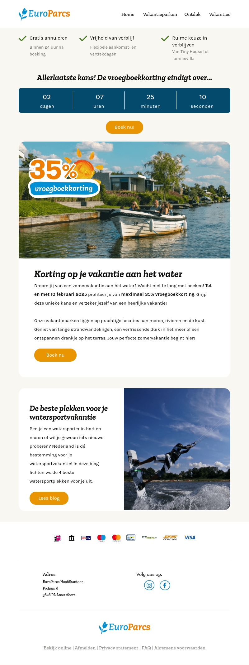 Mis deze unieke kans niet om te profiteren van maximale vroegboekkorting van 35% bij EuroParcs. Of je nu droomt van een vakantie aan het water of een watersportavontuur, dit is het moment om te boeken. Duik in het avontuur en geniet van prachtige locaties langs meren en rivieren. Jouw ideale zomervakantie begint hier.